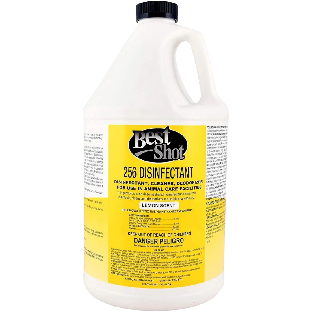 Best Shot Lemon 256 Disinfectant one-step concentrate that cleans, deodorizes, and disinfects with a lemon scent.