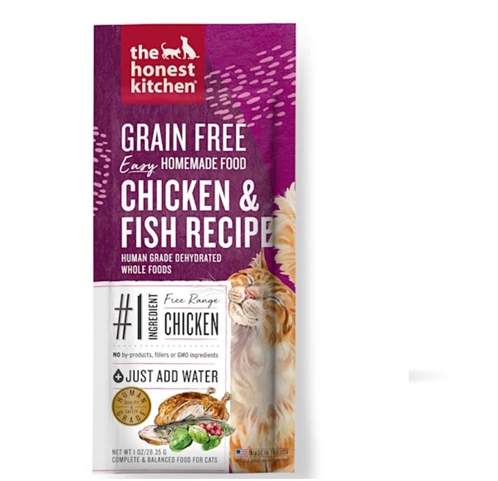The Honest Kitchen believes human grade, whole foods provide pets the best nutrition possible. This grain free chicken and fish recipe is made with uncompromising quality control standards using real, whole food ingredients that are gently dehydrated to maintain nutrients & taste. To meet their human grade standard, they use the same whole foods you'd recognize in your own kitchen, and make this recipe in a human food facility. Just add warm water and wait three minutes for a tasty, homemade meal that you and your pets will love!
