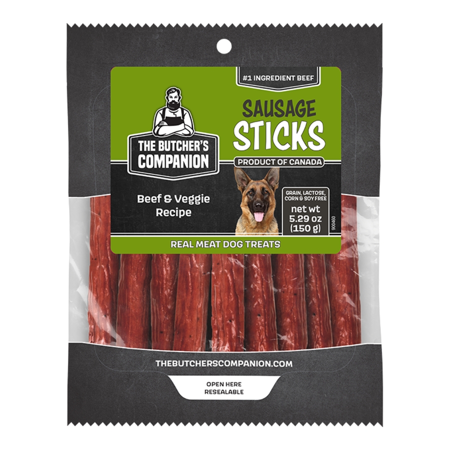 Beef & Veggie Recipe Sausage Sticks made with premium quality, human-grade ingredients. These real meat dog treats are naturally smoked, high in protein, and full of nutrients with the addition of peas, carrots, and beets.