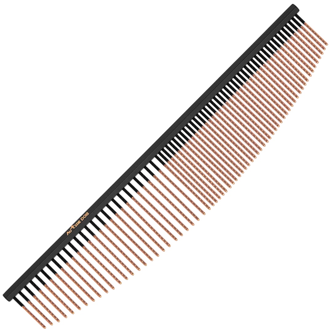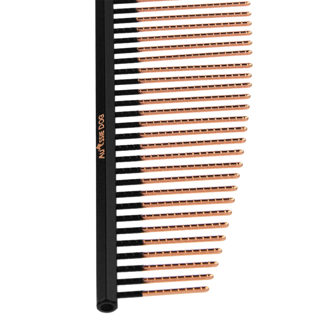 Aussie Dog 7.5" Halfmoon 50/50 Ionic End Strip Comb With Spiral Pins perfect for face and all coat types.