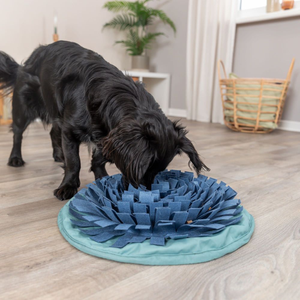 Unleash the thrill of the hunt with the TRIXIE Dog Activity Snuffle & Seek Bowl! This innovative toy combines your dog's foraging instincts with a fun, interactive challenge. The fabric folds hide treats, keeping your pup mentally stimulated and physically engaged. Watch them get excited and sniff out every delicious morsel, mimicking their natural behavior. A snuffle mat isn't just playtime fun - it promotes slower eating, reducing the risk of overeating and bloating. Plus, the mental stimulation helps relieve stress and boredom, keeping your pup calm and content. The natural felt is gentle on your dog's nose and paws. The non-slip bottom ensures it stays put during enthusiastic sniffing, and the machine-washable design makes cleaning simple. The included drawstring allows you to adjust the difficulty, keeping your pup engaged for even longer. Training instructions are provided to get the sniffing party started!