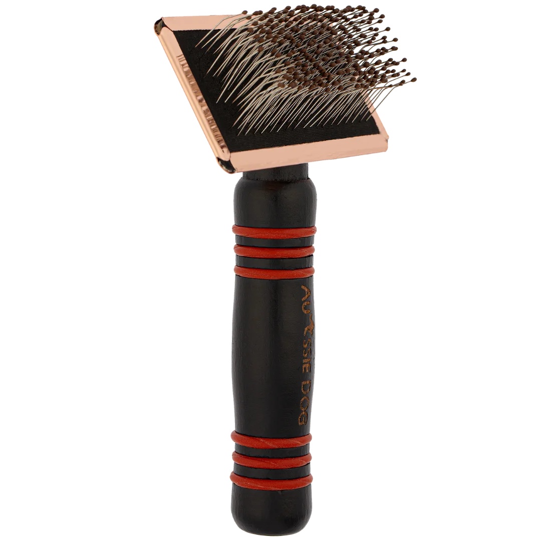 Aussie Dog Extra Long Super Soft Pin Brush copper-fused ball tips, and ergonomic Kanga wood handle gentle detangling for all coat types.