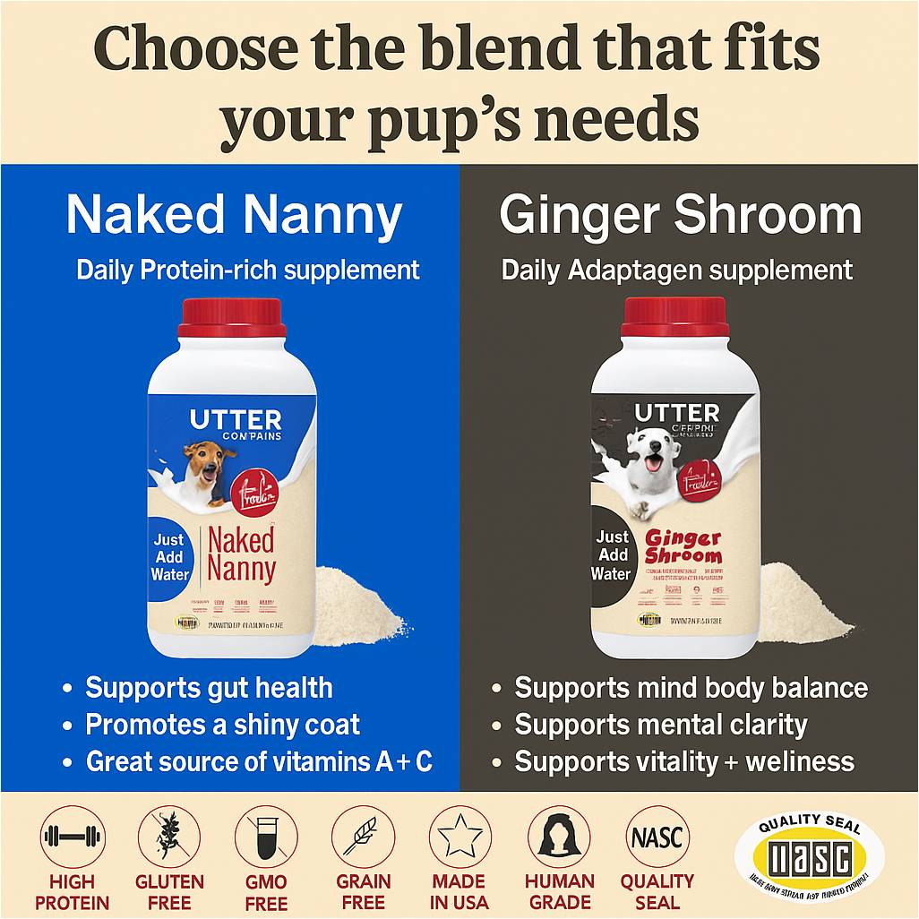 Utter Goat Milk Naked Nanny is a great source of A and C vitamins, minerals, and fatty acids...and a delicious way to bring out the bowl-licking, tail-wagging superstar in your pooch.
