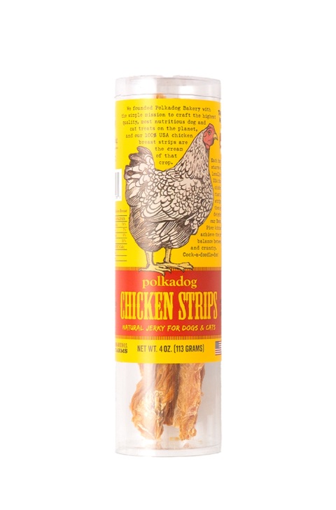 We founded Polkadog Bakery with the simple mission of crafting the highest quality, most nutritious dog and cat treats on the planet, and our 100% USA chicken breast strips are the cream of that crop. Each batch of chicken strips for dogs starts with locally sourced USA farm-raised chicken. We hand strip and gently dehydrate the chicken in our Boston kitchen to achieve the perfect balance between meaty and crunchy. Cock-a-doodle-doo!