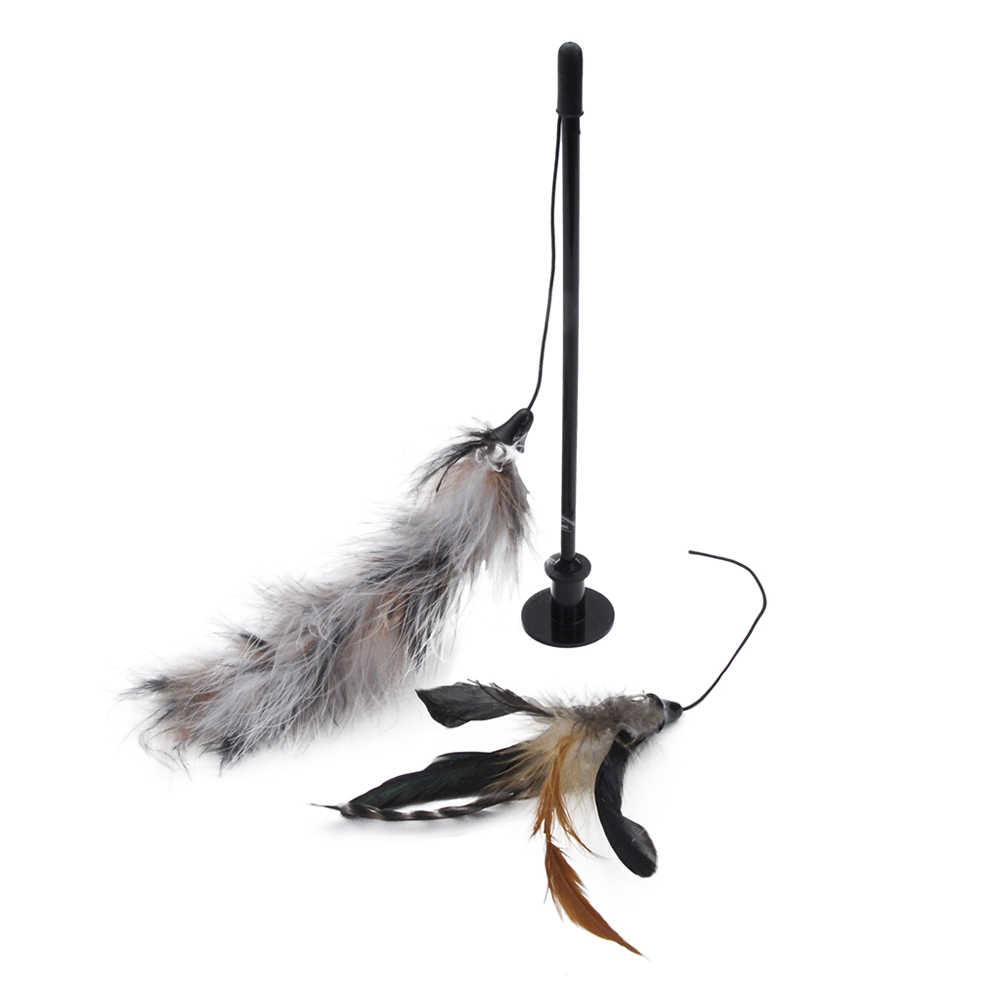 “Fox tail” and feather toys include bells and are interchangeable attachments to keep your cat entertained for hours.