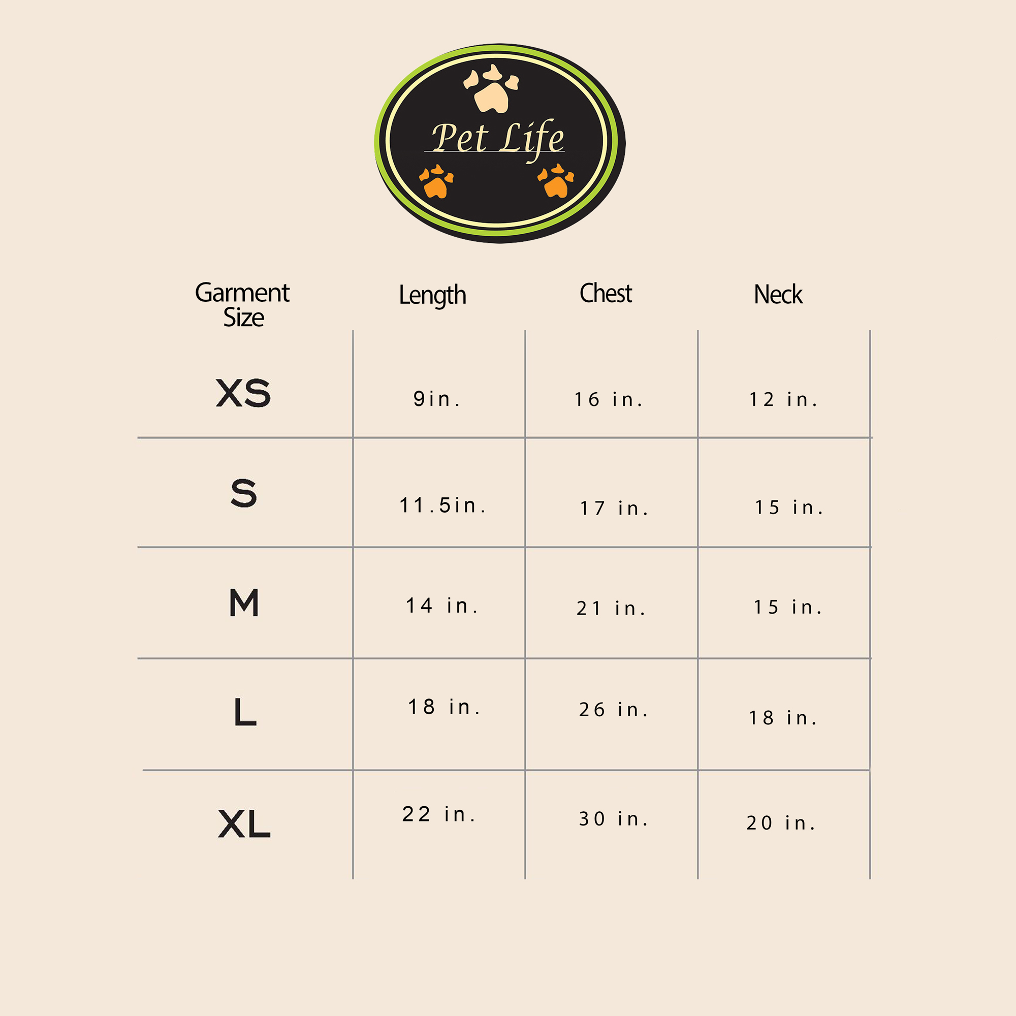 Pet Life Coat Sizing Guide: From Back of Neck to Tail area (in inches) EXTRA SMALL: 8", SMALL: 10-12", MEDIUM:14-16", LARGE: 18-20", EXTRA LARGE: 22-24".